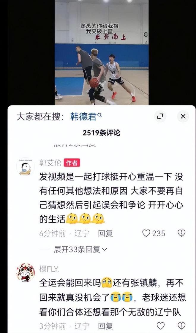 看到这一情况,郭艾伦不得不在留言区辟谣,他写道:“发视频是因为一起打球挺开心重温一下,没有任何其他想法和原因,大家不要再自己猜想,然后引起误会和争论,开开心心地生活。”